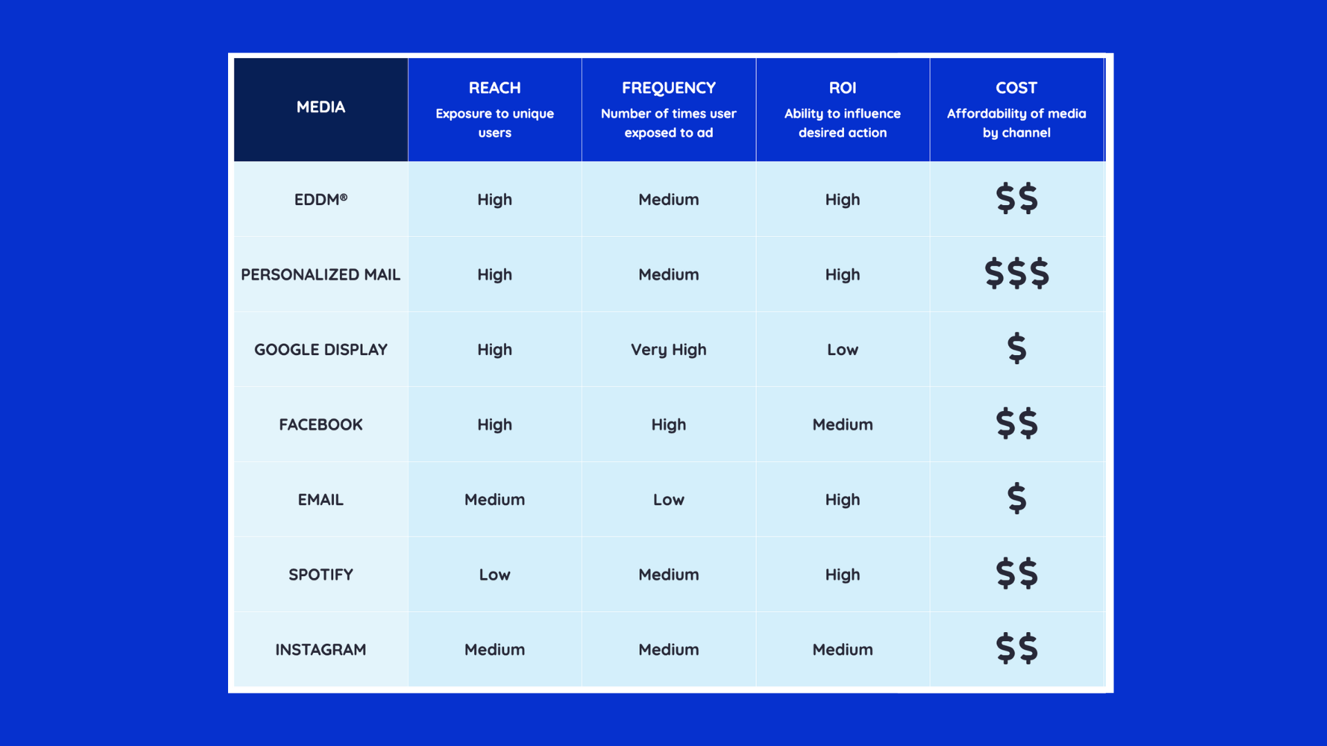 Are you aiming for local visibility? EDDM and personalized mail might be your best bets. Seeking wide online exposure? Google Display Ads and Facebook have you covered. Want to reach a niche interest? Spotify or Hulu could be your go-tos.