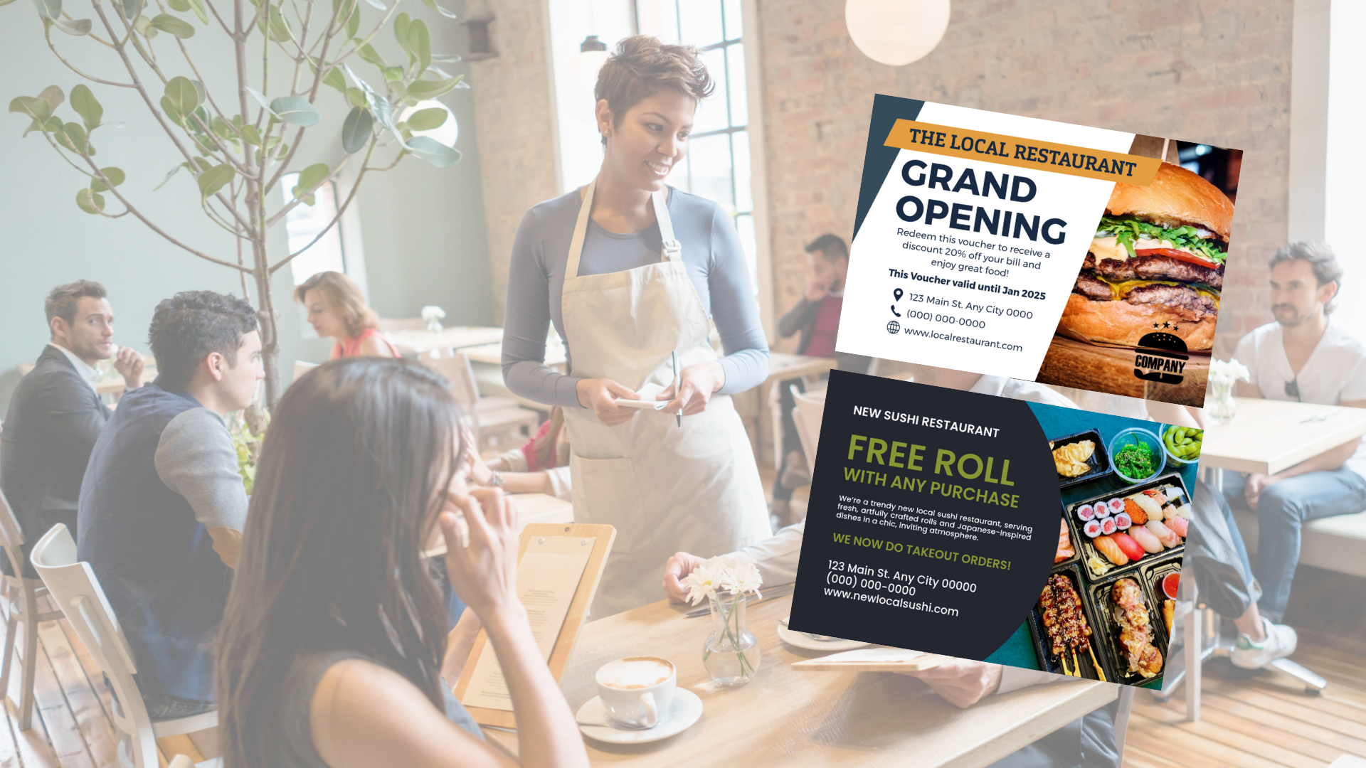 For design tips for restaurants, use a digital font that mimics handwriting, like "Pacifico" or "Dancing Script", to jot a line like "Can't wait to serve you!" next to your offer.
