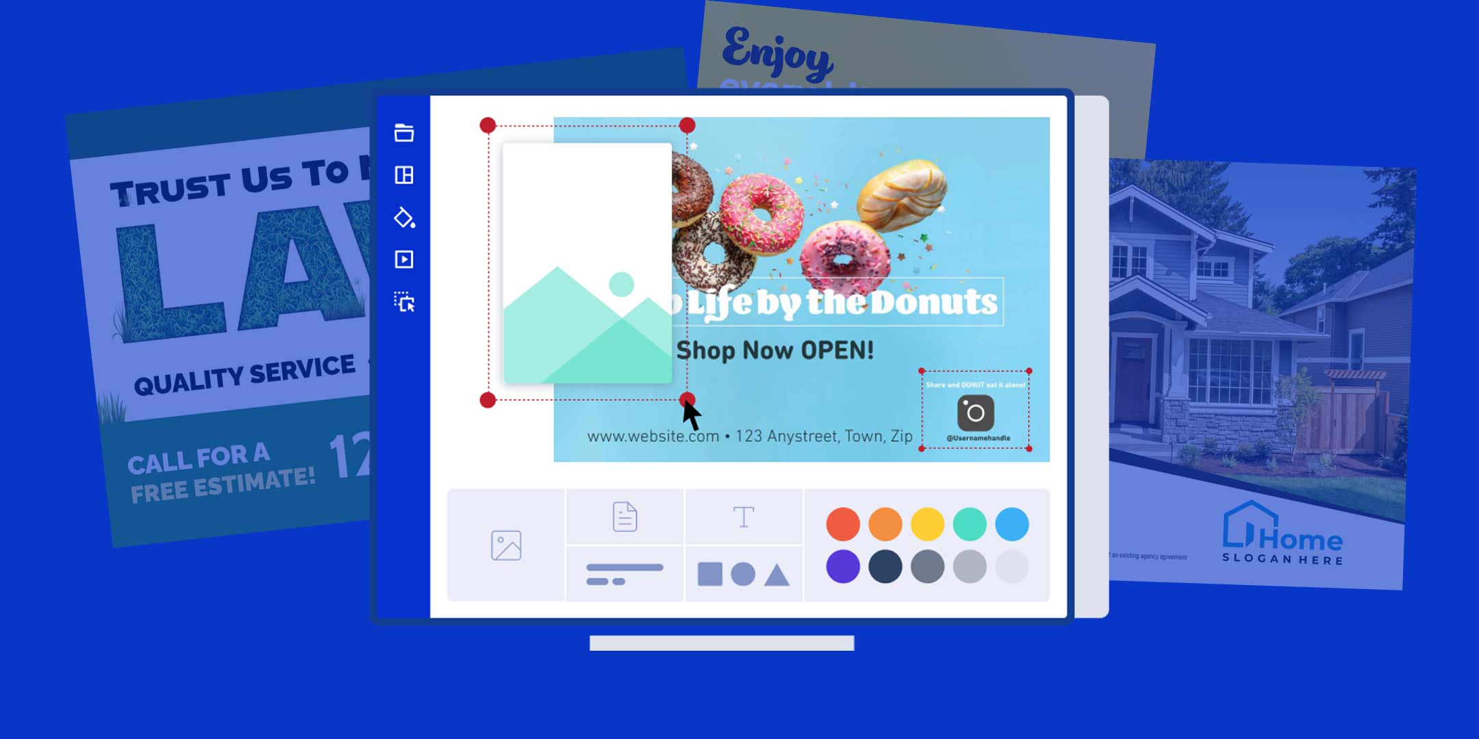 - Now, after selecting the template that fits your brand best, it is time to customize it. This is where you will add your company’s specific details – location, contact info, logo, slogan, and any extra details you would like on your postcard. This customization process is as easy and straightforward as it gets. Simply, click on the image, section, or text you would like to edit and you'll be able to adjust it. Check out this video for an in-depth tutorial on how to customize your template!