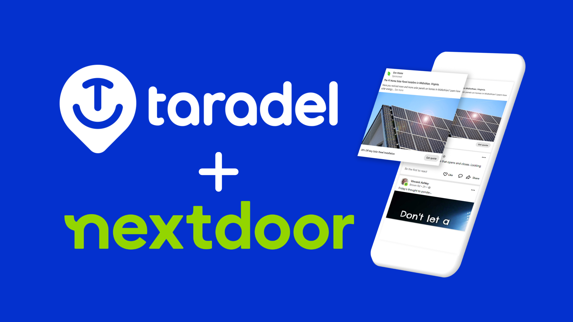 GLEN ALLEN, VA, UNITED STATES, March 6, 2024 -- Taradel, a leading provider of multichannel marketing solutions, and Nextdoor (NYSE: KIND), the essential neighborhood app connecting people to local businesses, are thrilled to announce an innovative partnership that integrates Nextdoor Ads API into Taradel’s marketing platform. This partnership aims to drive local business engagement, nurturing community awareness and energizing neighborhood economies by simplifying how and where small businesses communicate with their most crucial audience—their neighbors—across multiple media channels.