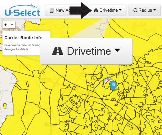 Using U-Select™ (the online mapping tool), you can effortlessly target addresses by clicking on the “Drivetime” button located in the top navigation menu (see image).