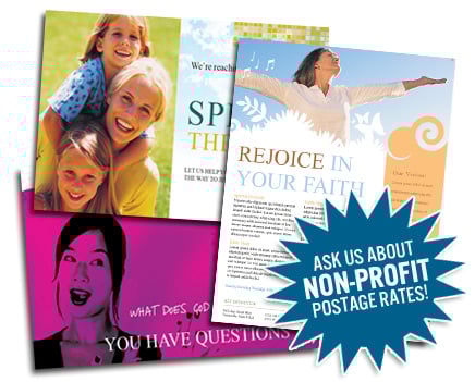 Yes! Churches with non-profit status qualify for even deeper postage discounts. For example, an entire mailing campaign with non-profit rates can cost as little as 22¢ per piece — designed, printed, and mailed w/ postage included.
