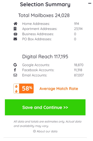 On the right-hand side of the map, you'll see a detailed selection summary, which provides you with quite a few useful insights into your chosen area. They include the total number of mailboxes, the average demographic match rate, as well as the potential digital reach, should you want to reach out to your audiences that way, too.