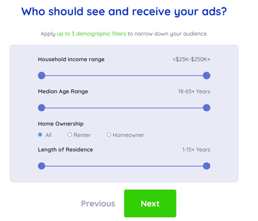 Now we're getting into the nitty-gritty details. In order for your campaign to be truly effective, we've provided you with a few demographic filters that will allow you to pinpoint the households you should target with greater accuracy.